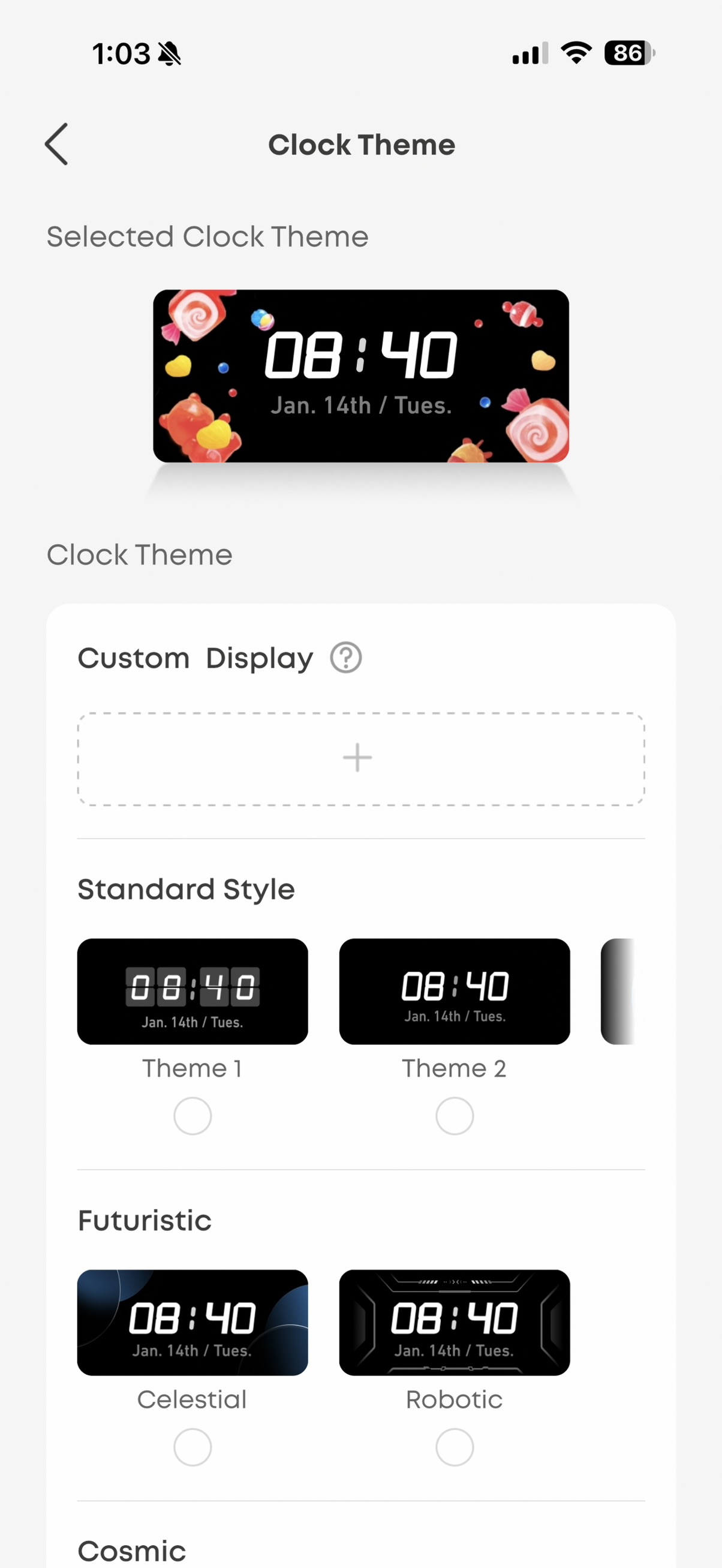 Also if I try to change the theme to any of the ones in the app by tapping the little circle underneath it, it will change on the device but on my app the spinning “Loading” pops up and after 30 seconds or so says it failed even though the device did change to the correct theme. If I then close the app and reopen it, it will show the correct theme in the Clock theme for what I picked.